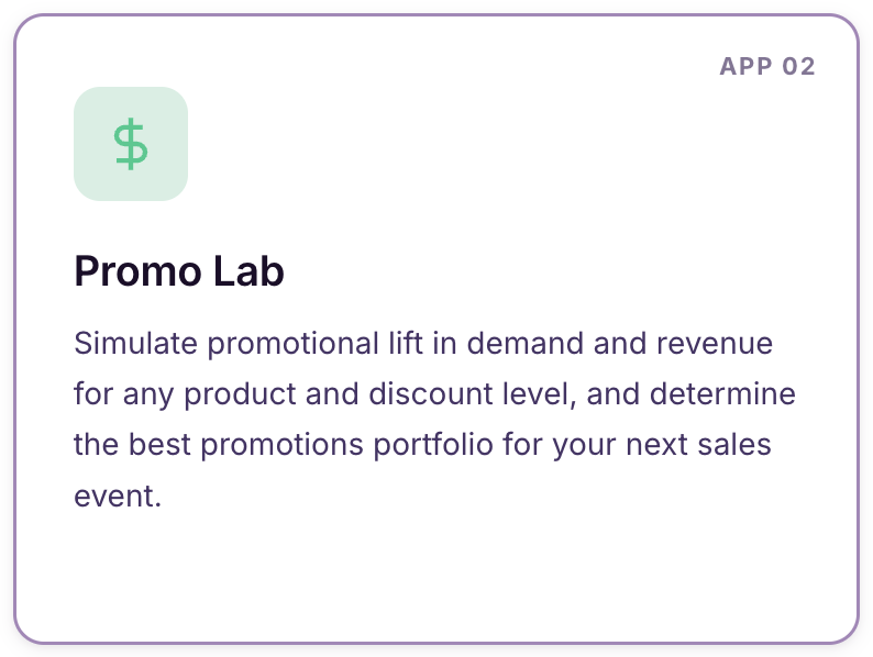 Simulates: Promotional lift in incremental demand and revenue at configurable discount levels for any promotional bundle; incremental promotional elasticity and cross elasticity