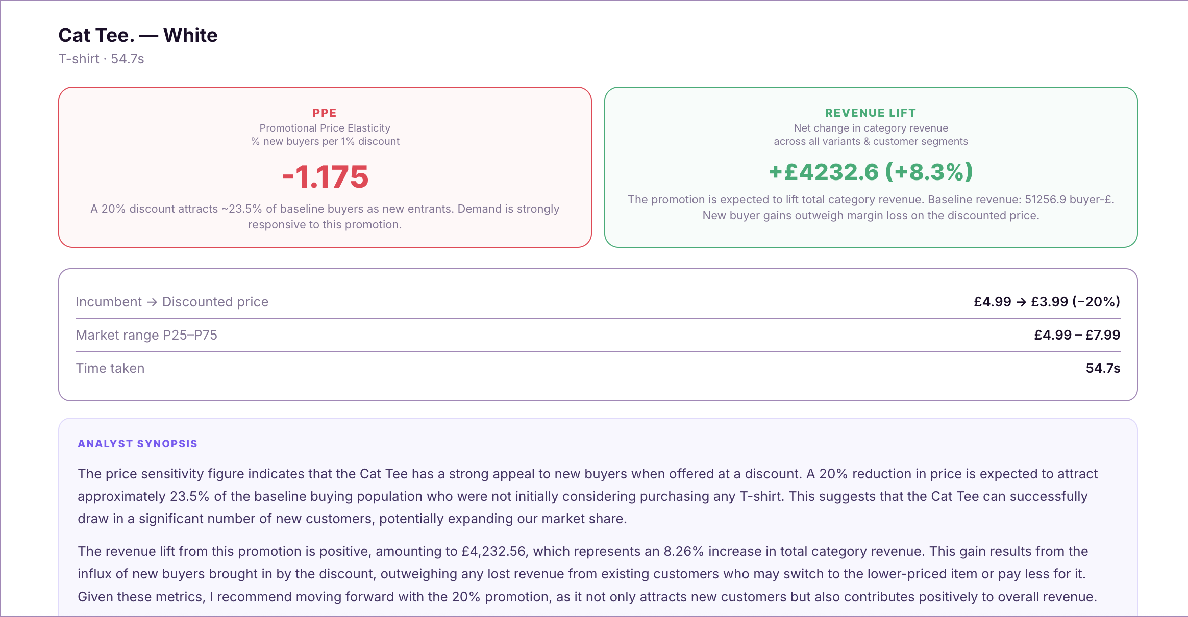 Use cases: Rank promotion bundles by uncannibalized revenue lift; make reprice vs. promote decisions